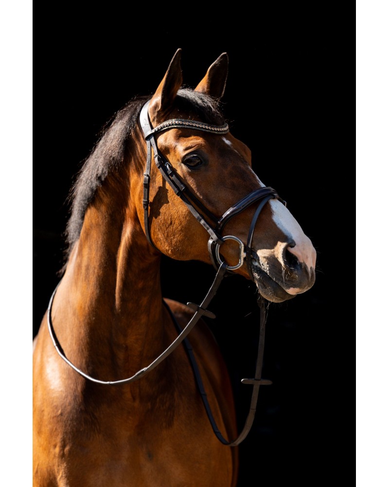Ce bridon est spécialement conçu avec une têtière anatomiquement rembourrée et échancrée. Sa forme réduit la pression derrière les oreilles et sur la tête. La muserolle est de forme anatomique, assurant un ajustement optimal.